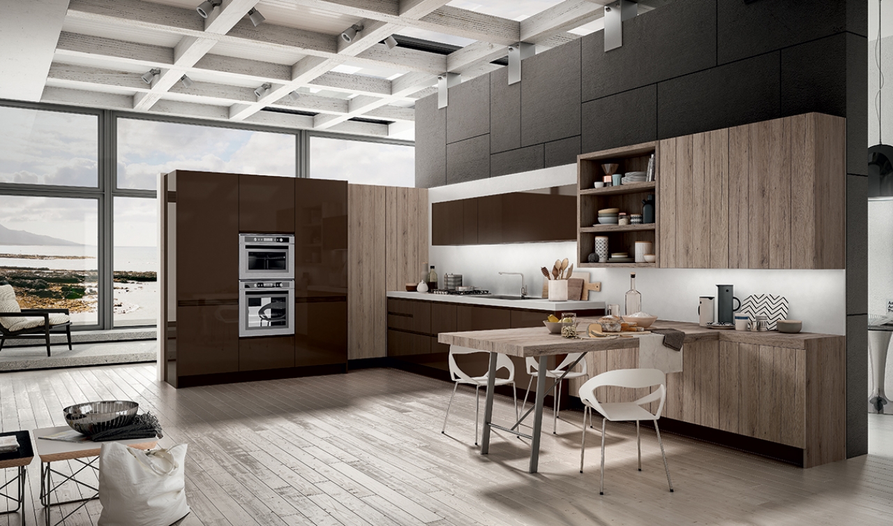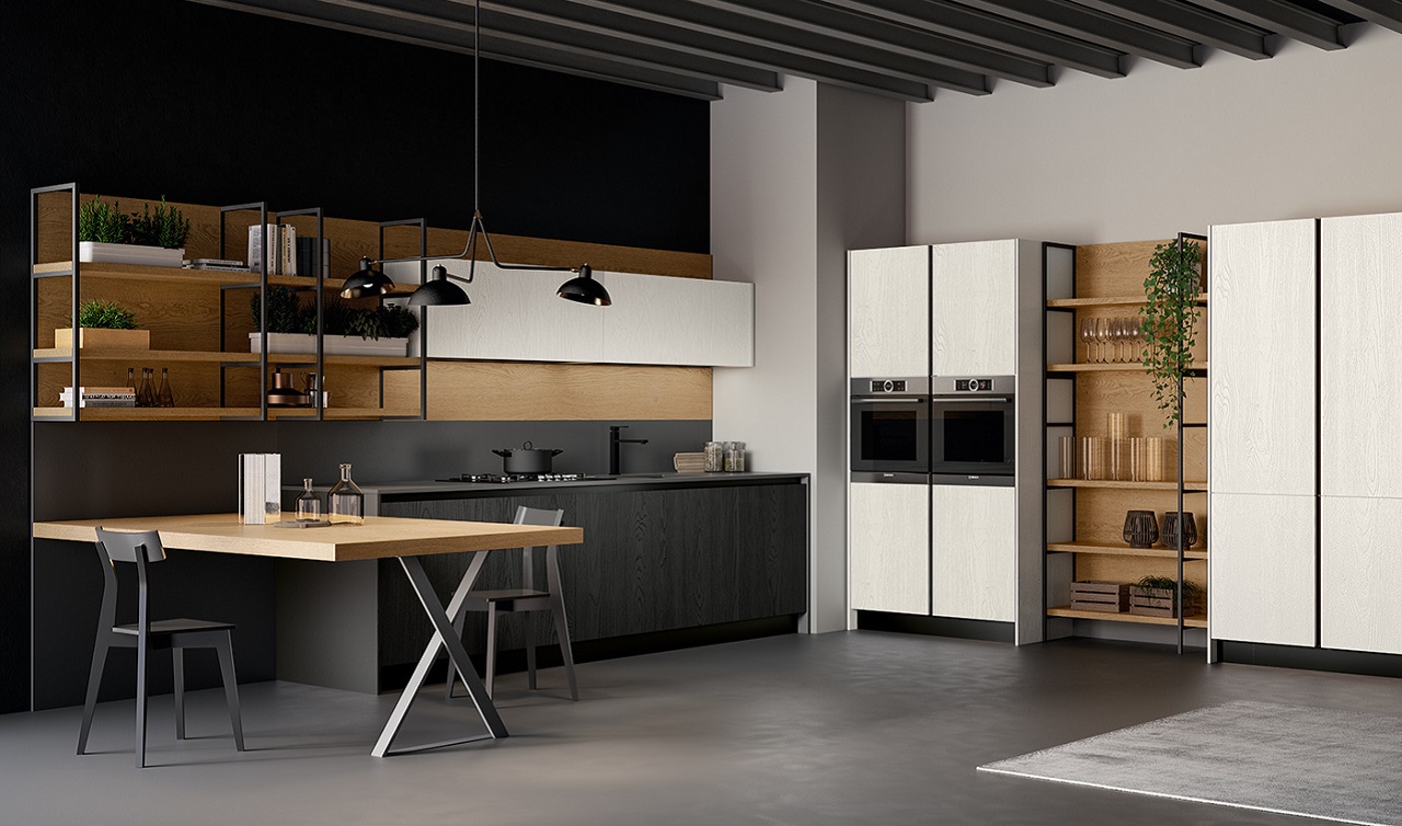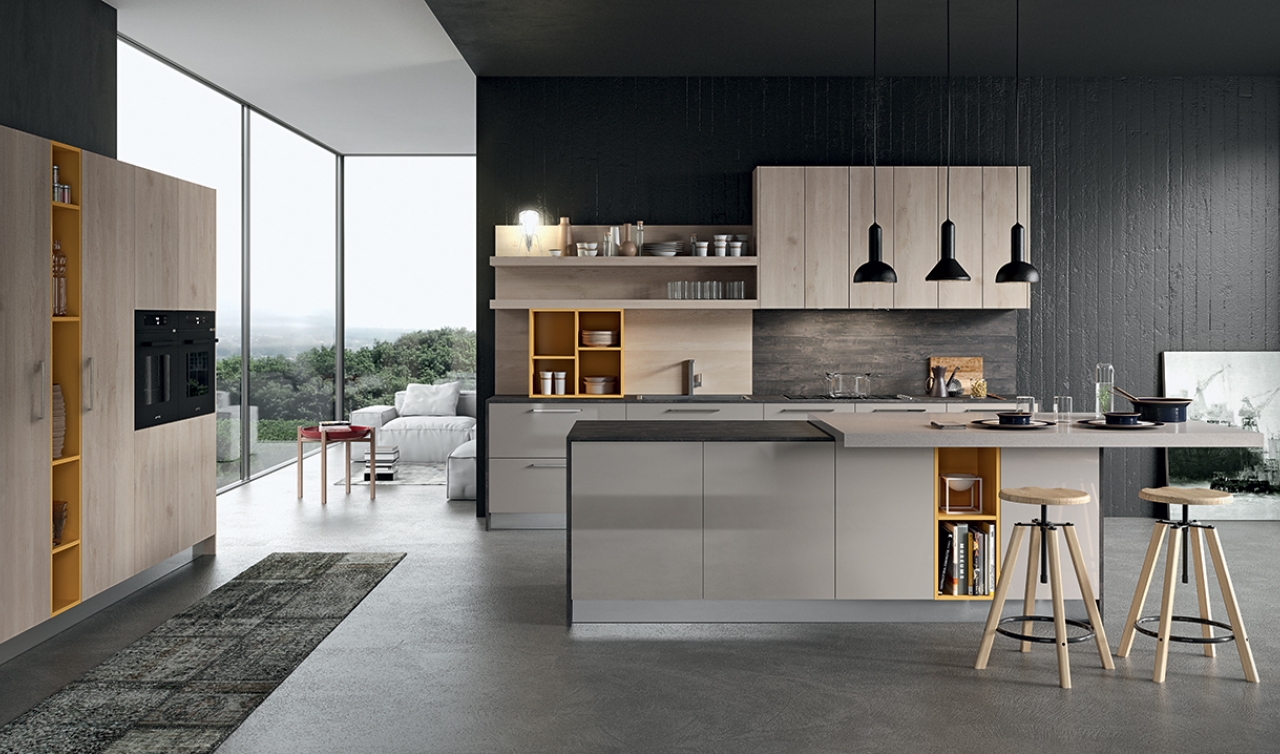 "una soluzione che aumenta l'ergonomia del progetto: crea maggiore spazio di lavoro e permette di abbassare i pensili rendendone il contenuto perfettamente a vista"